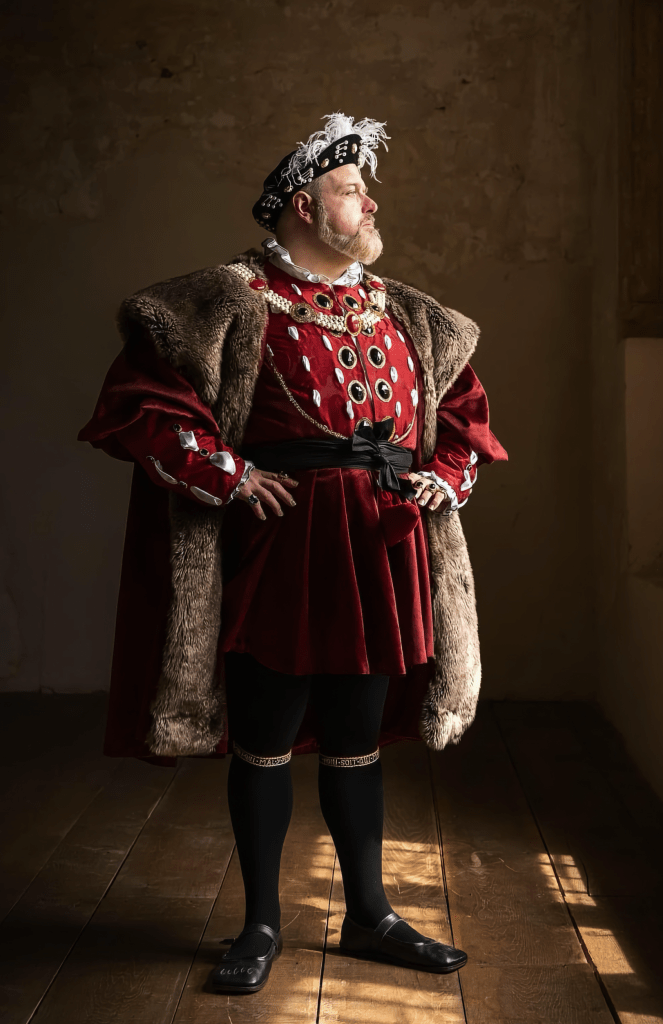 I started with The Tudor Players as Charles Brandon, the first Duke of Suffolk and made my debut at Chenies Manor. I was hooked and slowly transitioned into becoming Henry VIII, an honour that has been bestowed upon me and one that I cherish. When dressed as Henry VIII, I strive to immerse myself in the mindset of a king while also exploring his vulnerabilities as a man.